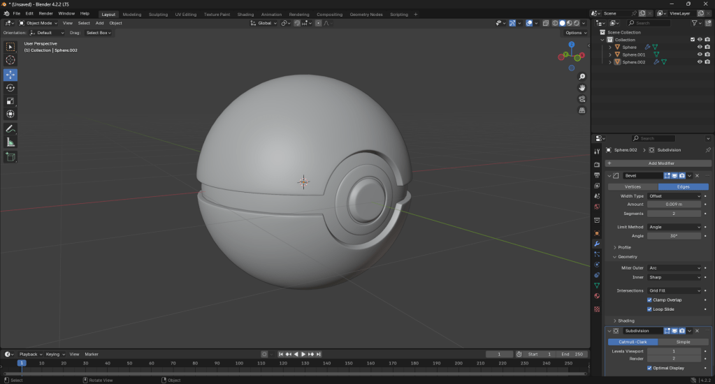 After, I took the front faces of the inner sphere and separated them from it. From those faces, I extruded and used a bevel on them to shape the button of a Poké Ball. I also used Shade Smooth on all the parts of the Poké Ball.