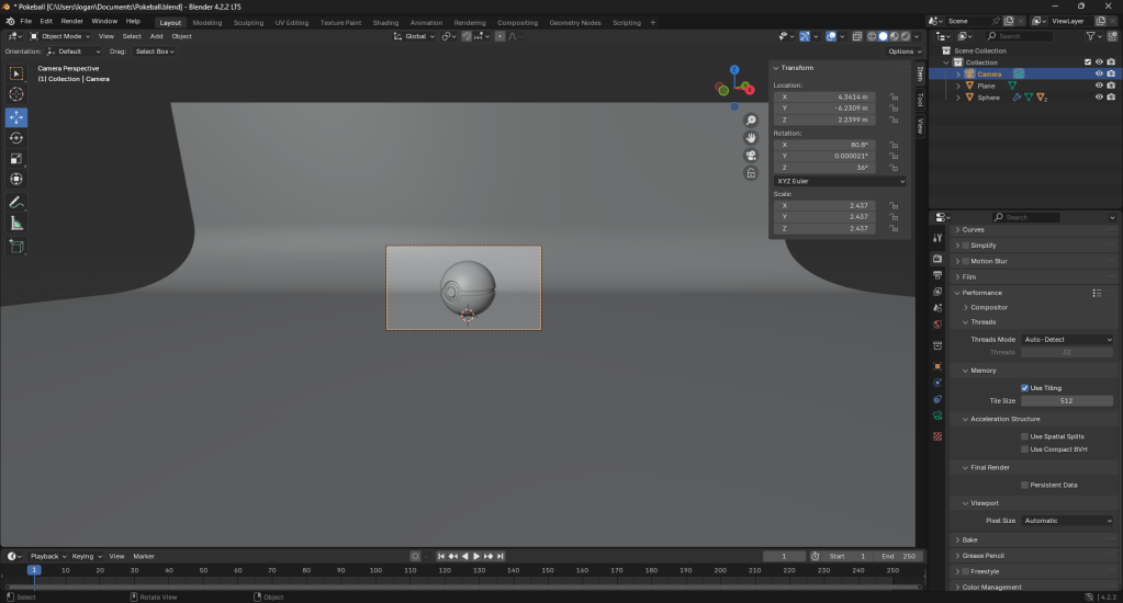 After I finished with that, I learnt how to set up a scene and I added a plane and extruded one of the edges behind the ball and used a bevel, then, I also set up a camera.