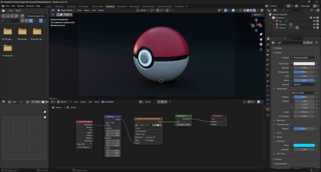 Once my camera was set up, I got to texturing the ball. I got a HDRI texture for the lighting from a website I found online: https://polyhaven.com/a/sunset_in_the_chalk_quarry