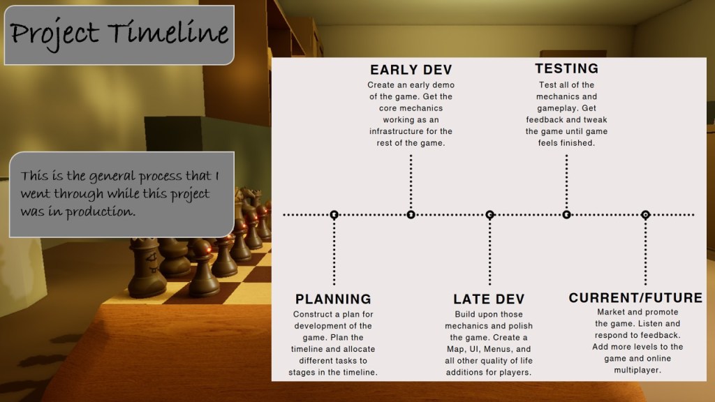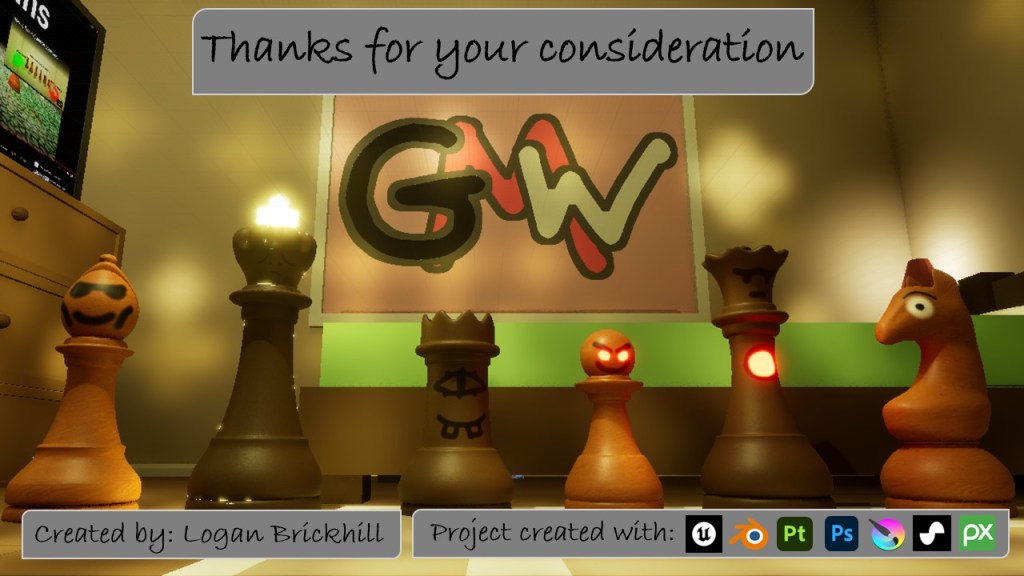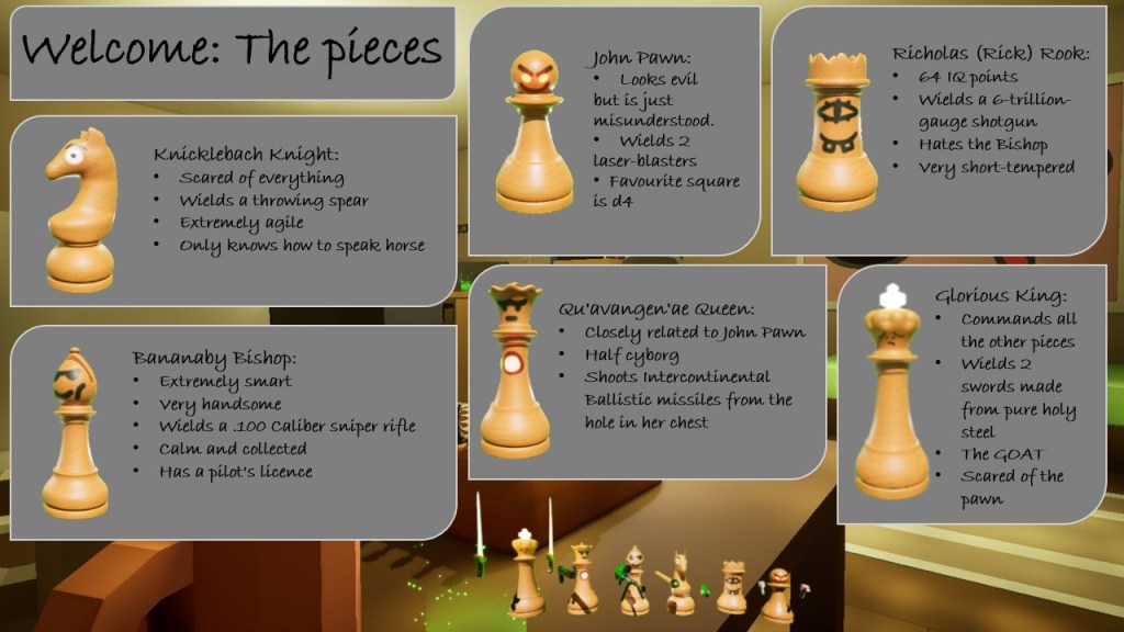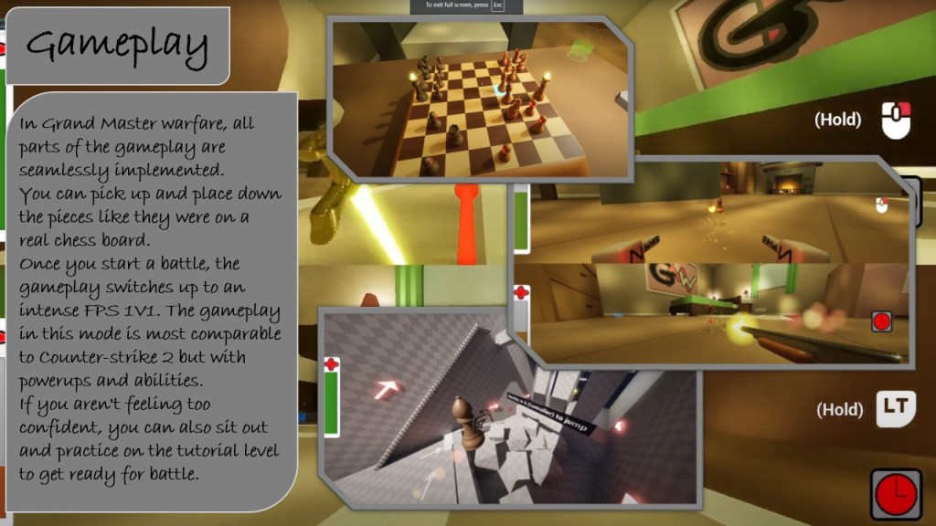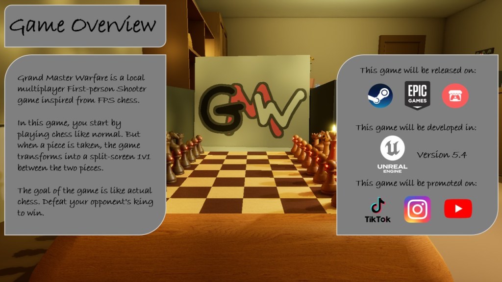 For Grand Master Warfare, I took very heavy inspiration from FPS Chess. I wanted to create a game like that, but with personality and more of a nostalgic feel. I chose a cartoony visual style for Grand Master Warfare because I wanted the game to feel fun and humorous to the player. During the production of this project, I have vastly improved my skills in Unreal Engine programming and Blender modelling. I have also learnt new skills such as texturing and UV unwrapping during the process of making the chess pieces. This project was very ambitious code-wise for the skills I had 2 months ago. I decided to go through with this idea because I knew it would push me into becoming much better at problem solving and programming. Overall, I am very happy that I did choose this idea because I am now much more confident with my skills and can very clearly see the improvement between previous projects and this one.