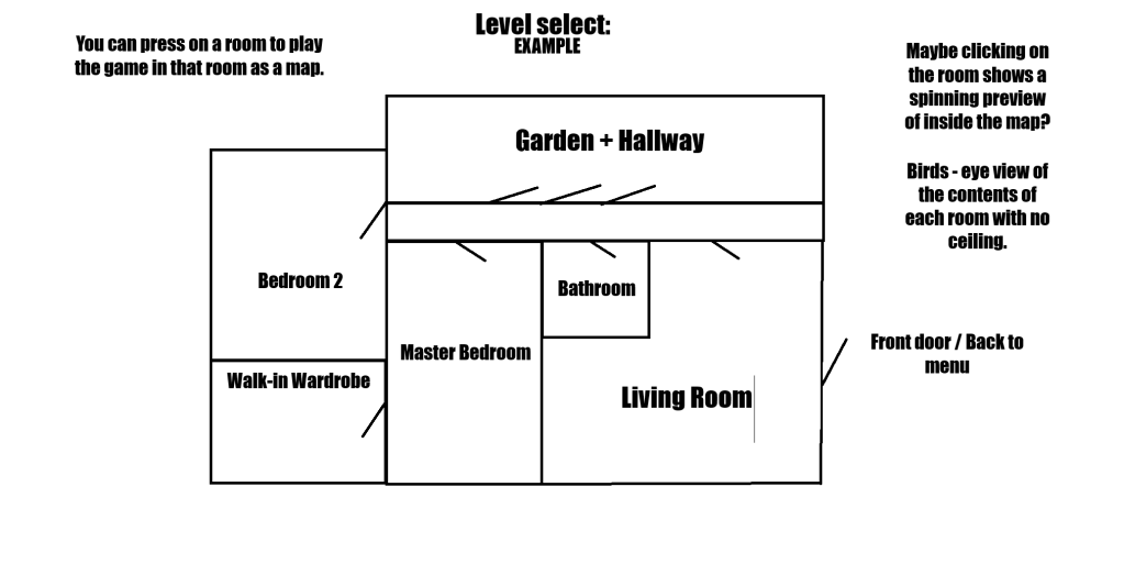 After conducting a survey for my game, one of the most frequent suggestions was to add more levels in my game. So if I have time to, I am planning to create the rest of the house to the room that I made and have a map for each room. I like this idea because it sticks with the theme of my game and could allow for a really cool level selection screen. I created a quick diagram to show the idea I came up with.