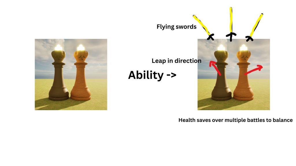 I’m pretty happy with these stats. I think that the weapons and abilities well reflect the piece and the personality I game them. I also thought of these with fun gameplay in mind; I made sure that they are all semi-even so that even a pawn is able to kill a king or a queen even though it is the weakest piece. I did this because I think it reflects on the actual game of chess and how even a pawn can win you the whole game.